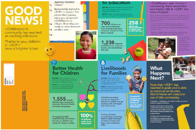 This project required exceptional leadership as eight departments and two external vendors had to work in tandem and cross functionally to ensure the successful transfer of over 20,000 child sponsorships, affecting over 12,000 donors. Focusing on core project management principles the cross-functional team created a single unified internal processing system, simplified the complicated communication plan and streamlined the digital experience. These improvements led to staff being better able to connect, engage and inform donors of the upcoming change, reducing confusion and concern and empowering donors with choice for their giving options resulting in with year over year improved retention rates and cost savings.
